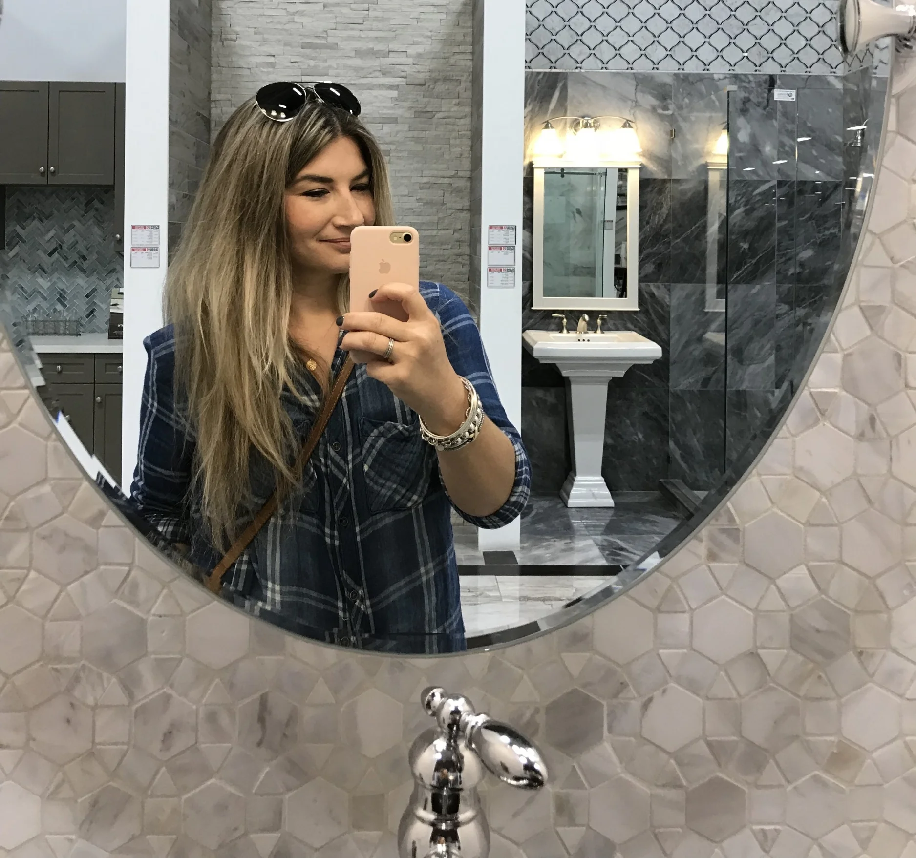 This beautiful mosaic marble tile backsplash was screaming for a mirror selfie!