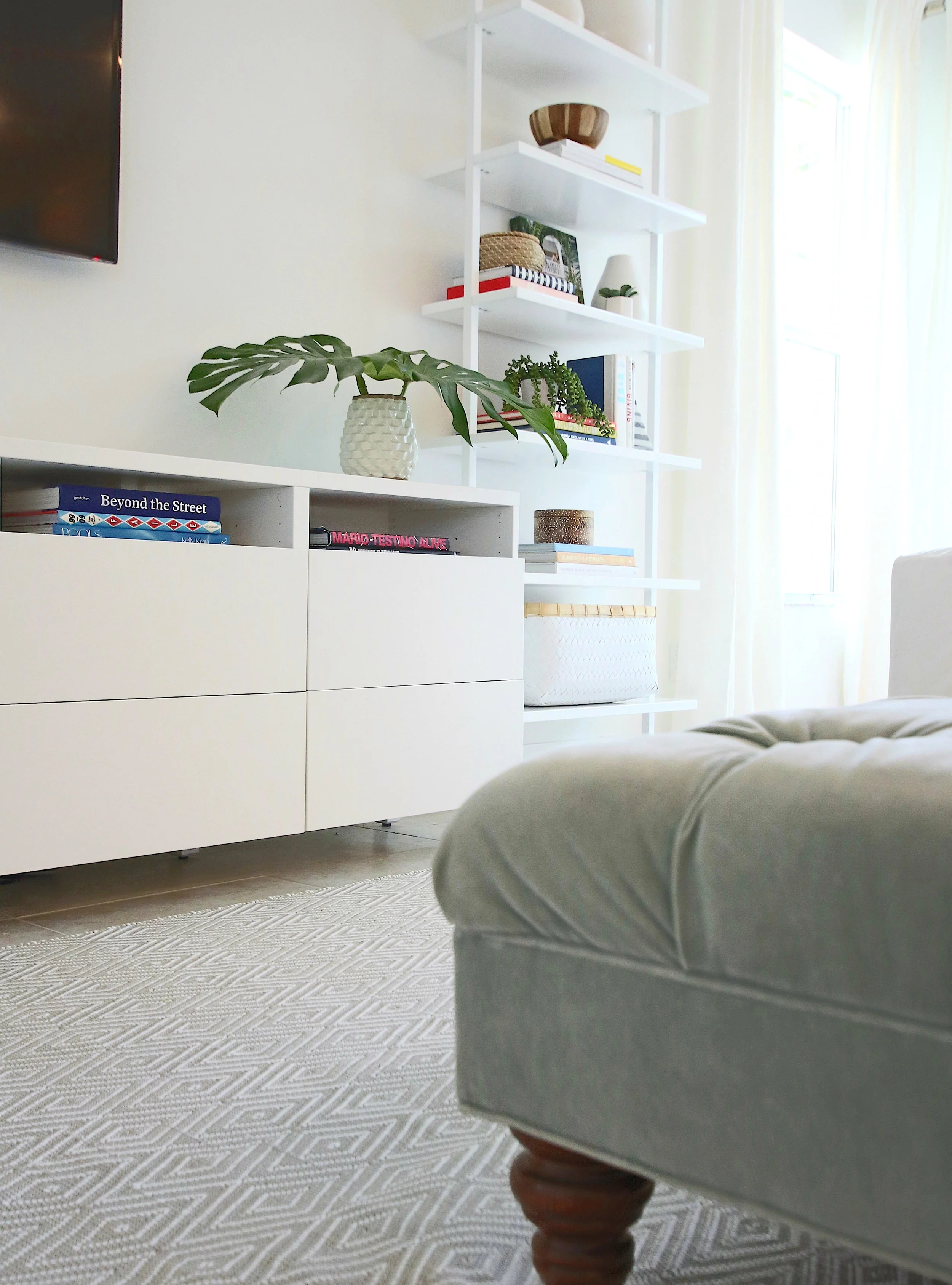 The Diamond Indoor/Outdoor Rug in Platinum was our front runner and am so thrilled we chose this beauty! From the moment it arrived I’ve been all goo-goo eyed over the patterned design. It’s large and in charge at 12’ x 16’ and really anchors the whole space. It is ridiculously soft underfoot and our friends and family still don’t believe it’s indoor/outdoor! Plus, if anything spills, all I have to do is use a mild cleaner and blot with a wet rag and the stain will literally disappear.